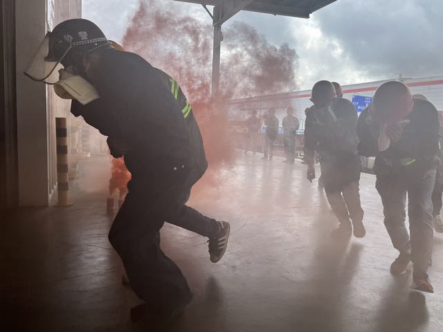 随后,员工们在仓库门口集合,由安全员逐个发放湿毛巾,随着烟雾弹冒起的滚滚浓烟,员工们立刻用湿毛巾捂住口鼻,弯下腰,按照指定路线沿着安全通道快速从仓库南侧跑向北侧,整个过程井然有序。