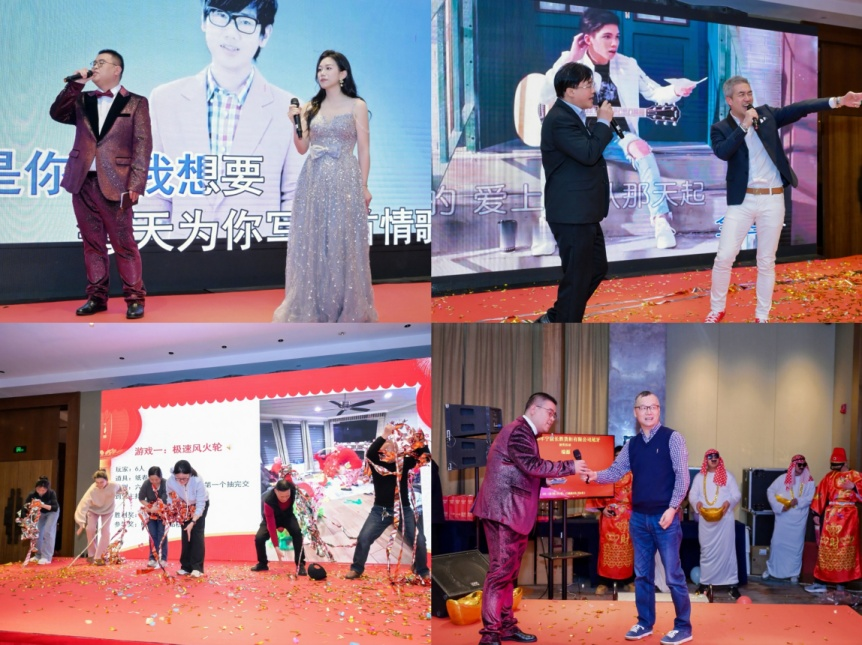 欢乐氛围持续升温,主持人率先用歌声点燃全场热情;随后总经理携手受邀来宾同台合唱,默契的配合、悠扬的歌声赢得阵阵喝彩,拉近了彼此的距离。现场还设置了许多抽奖环节与趣味游戏环节,一轮轮幸运揭晓、一场场趣味互动,让台下掌声、欢呼声不断,来宾与员工们踊跃参与、开怀大笑,脸上都洋溢着幸福的笑容,将晚宴的欢乐氛围层层推向高处。