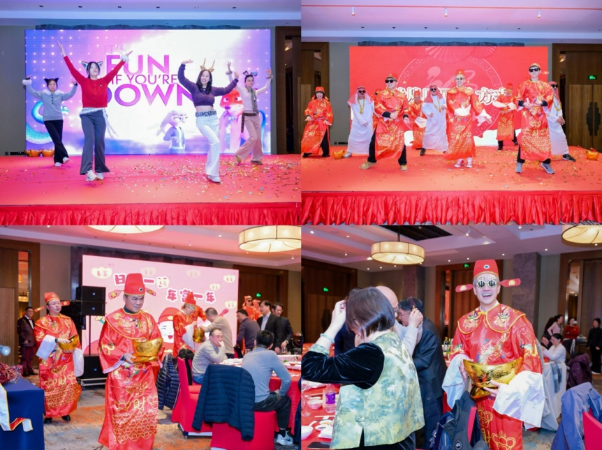 文艺表演环节亮点纷呈, 4位女生身着靓丽服饰,带来舞蹈《疯狂动物城》,展现了青春活力,赢得台下阵阵掌声;而整场晚宴最令人瞩目的,当属男生及公司领导们共同演绎舞蹈《八方来财》,他们惊艳登场,欢快的舞步、喜庆的装扮,将“招财进宝”的美好寓意展现得淋漓尽致。表演中途,领导们身着财神服,手持金灿灿的金元宝走下舞台,亲手向台下的来宾与员工分发红包、糖果等小礼物,现场人员争相互动、欢笑雷动,来宾与员工们既惊喜又感动,沉浸在浓浓的年味与暖意之中,成为整场晚宴最难忘的高光时刻。